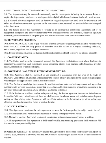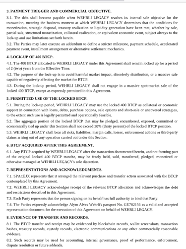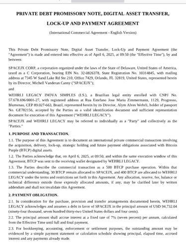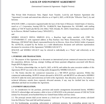 Provision for 500 BTCP in the transaction, with 30 BTCP for SPACEJX and 400 BTCP for Wehrli Legacy;